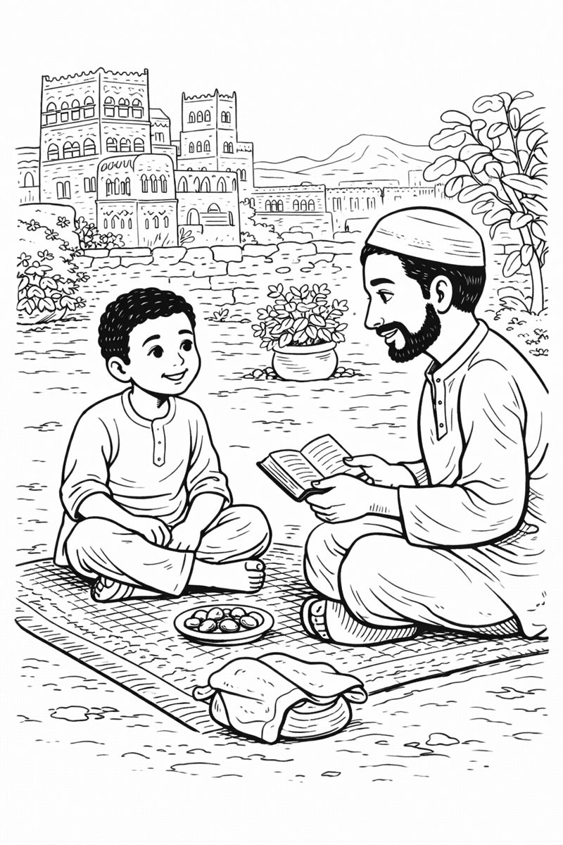 Colour Ahmed sitting with his father on a woven mat outdoors. They are reading together beside plants and a garden wall. In the background, tall traditional buildings with patterned windows rise against distant hills, showing historic city life in Sanaa.